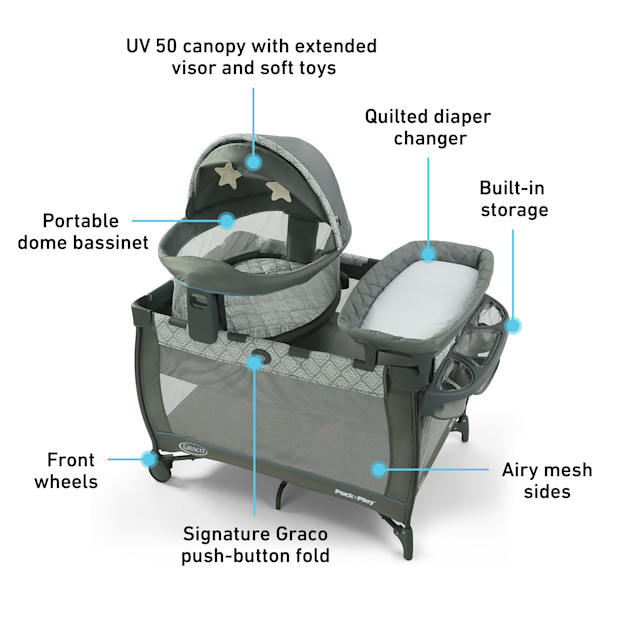 This care station has integrated storage for babys essentials a canopy with soft toys wheels for easy portability Gracos signature push-button fold and a convenient carry bag for easy storage and travel. Though not without their imperfections generally speaking their Graco Pack and Play are well made safe and in my mind a-cant-go-wrong registry addition. The sides are made of mesh but the mesh can tear and create a small hole.